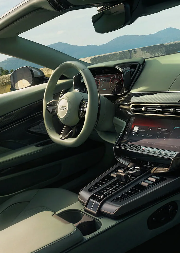 Surrounded by indulgent luxury that focuses on both driver and passenger. Every control ergonomically designed. Exquisite haptic feedback complementing the advanced digital architecture for a perfect blend of digital precision and analogue beauty. A clean, commanding dashboard with design principles that accentuate Vanquish Volante’s seamless surge of power and muscularity. A direct link between the engine and the interior environment.
