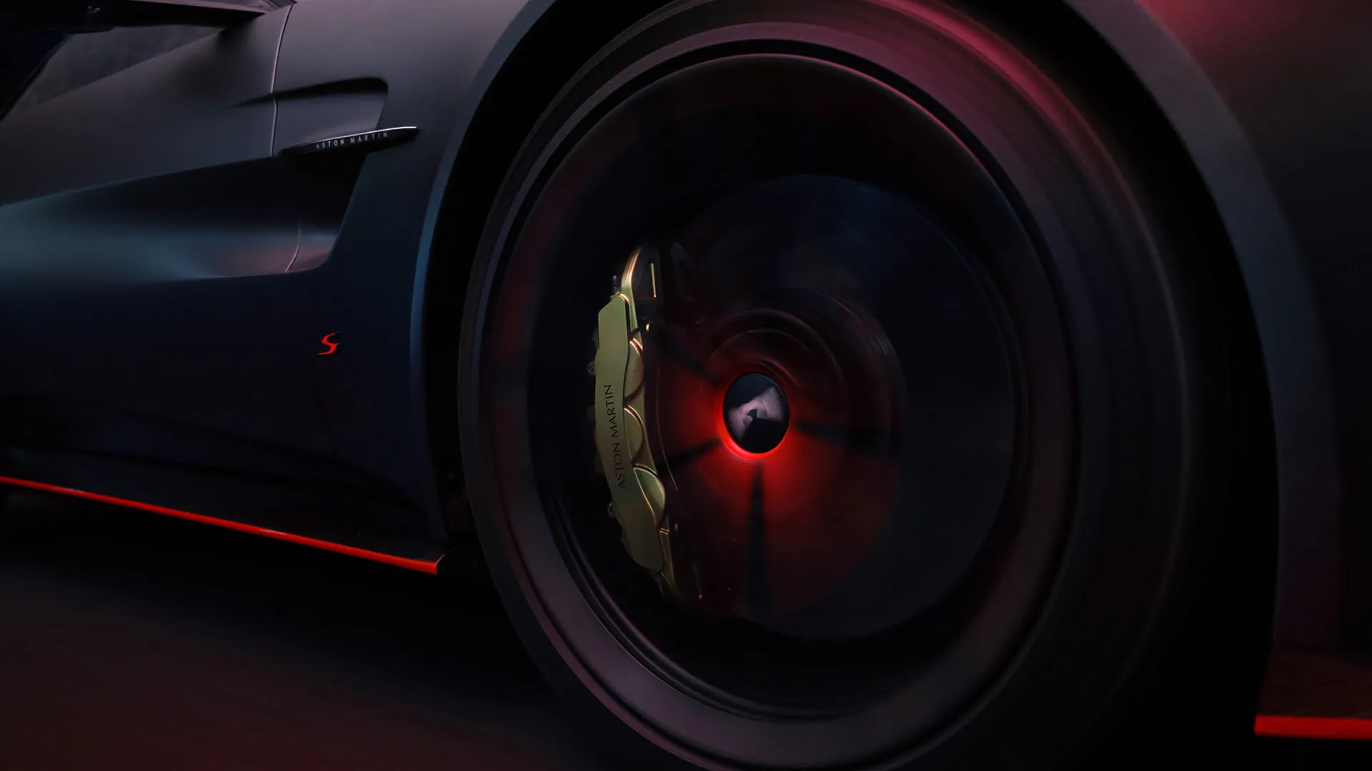 Available with Carbon Ceramic Brakes (CCBs), a further 27kg of unsprung mass can be reduced. Vantage S brake discs are 400mm at the front, 360mm at the rear. Grooved and drilled for superior thermal management. Increasing braking efficiency and reducing brake fade at temperatures nearing 800 degrees. Boosting driver confidence for later braking. Empowering the driver to push the limits further. Painted brake calipers, fitted in Black, Red or Aston Martin Green as standard, offer a striking accent of colour and an evocative signal of performance.